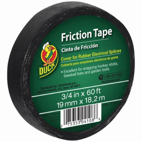 3/4" inch x 60' foot roll of Duck black friction tape. This tape is excellent for wrapping hockey sticks, baseball bats and garden tools along with many other use cases. Traditional cover for rubber electrical splices.