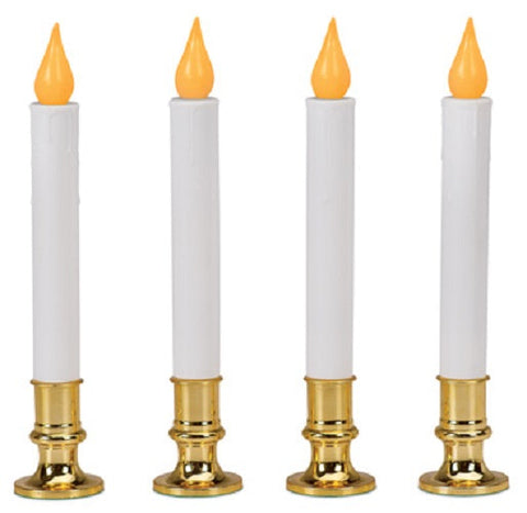 Sylvania, 4 pack, 9" battery operated flickering led candle, orange led, gold/brass base, stays on 8 hours, turns off for 16. Requires 2 "aa" batteries, NOT included, lasts up to 50 days with 1 set of batteries.