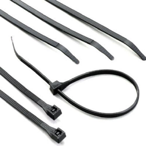 100-Count pack of 11" black nylon cable ties.  These cable ties are ultra violet resistant and have a 75 LB tensile strength rating and are one piece and self locking.  These are bagged.