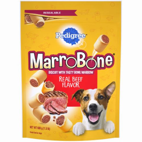 Pedigree, 24 OZ Marrobone Dog Snack. Delicious real bone marrow taste wrapped in a crunchy biscuit helps promote a shiny coat. healthy teeth. and bones.  Enriched with Vitamins A. D & E. Treat specifically made for small to large dogs.  Crunchy snack with real bone marrow.