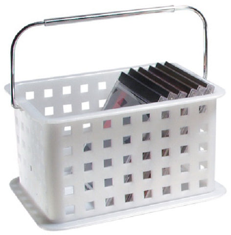 Plastic Basket with Handle that can serve many storage and organization uses throughout the home, drain holes to keep basket dry. 6-1/2" x 9" x 5", Chrome Handles, Matte Surface, Stackable, Drainage Holes On Bottom For Shower Or Household Use.