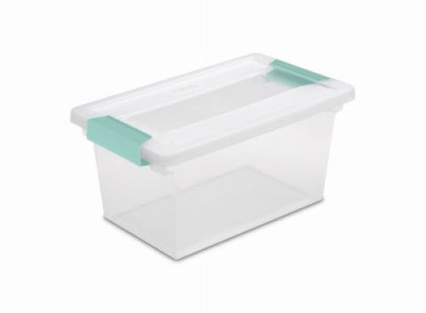 Sterilite medium clip box with clear base and lid with aqua chrome latches. The medium clip box is a great solution for storing and organizing smaller items in the home and office. The clear base and lid allow contents to be easily identified from any angle, and the tight-clasping latches ensure that the lid remains secure to the base.