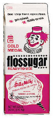 Gold Medal Flossugar is made from a special sugar - not too fine, not too coarse. Colors have been "vividized" so that you get a bright color, but color concentrations do not exceed the limits set down by Food & Drug Administration's GMP Directives. Flossugar is packed in sealed 3 1/4 lb. cartons. Open the box and pour into the spinner head-no messy mixing or unsanitary sugar buckets. Inventory is easy and more accurate. Six 1/2 gallon cartons - 19.5 net weight lbs. per case on all flavors.