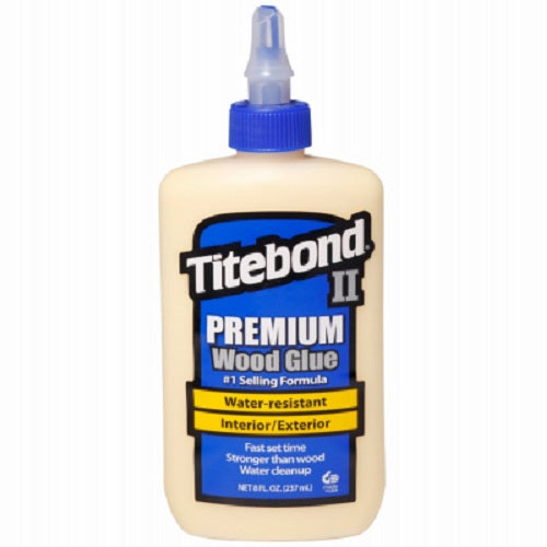 Titebond II 8-oz premium wood glue, sandable, paintable, water solvent & non toxic, ideal for exterior woodworking projects, including outdoor furniture, birdhouses, mailboxes, planters & picnic tables, FDA approved for indirect food contact cutting boards, VOC compliant.
