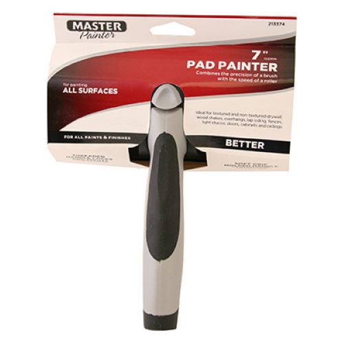 Master Painter 7" pad painter applicator. This pad painter applicator has an absorbent flocked pad with a beveled edge. Flexible adjustable threaded handle with a rubberized contoured grip. Great to use on walls, paneling, doors, cabinets, ceiling tile, exterior siding, shingles, masonry & decks. Can be used with all paints & stains.
